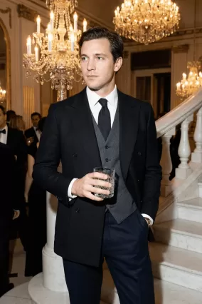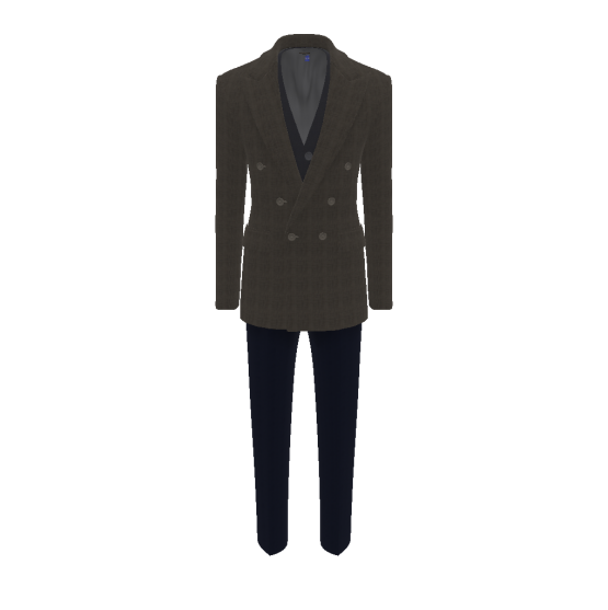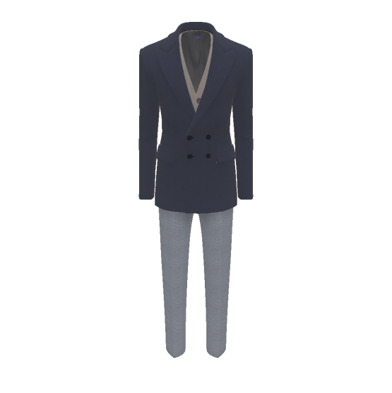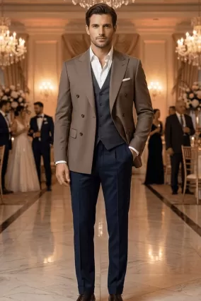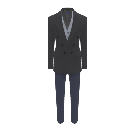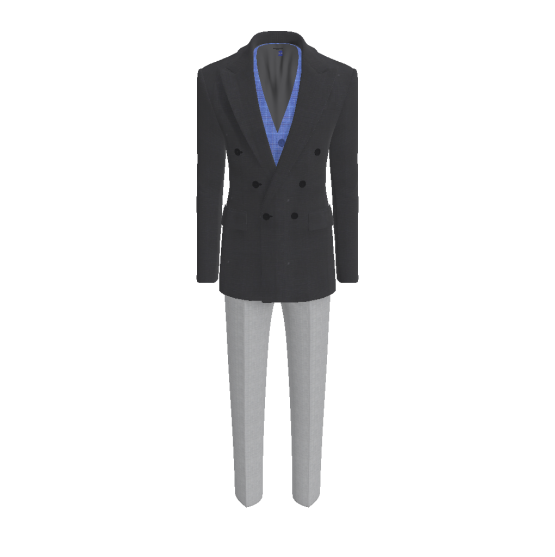 Elevate your presence with a 3-piece ensemble meticulously crafted to your precise specifications, guaranteeing an impeccable fit that radiates refined elegance. This collection masters the "broken suit" aesthetic, pairing a formal 6-button double-breasted jacket in solid black with high-contrast sapphire and slate grey elements.