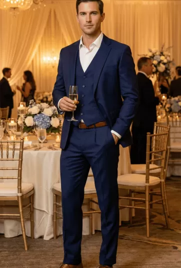 Navy Blue Wool Blend Slim-Fit Pleated Dress Pants - M3HL46