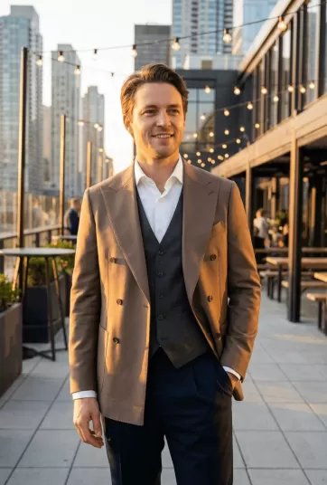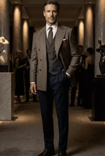 Taupe Brown jacket - Charcoal Grey vest - Navy trousers