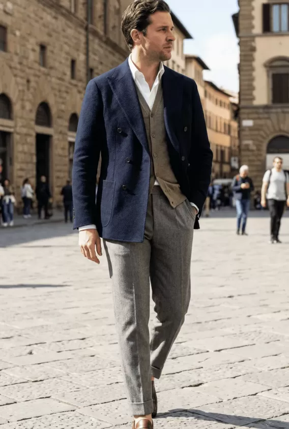 Taupe Brown jacket - Charcoal Grey vest - Navy trousers