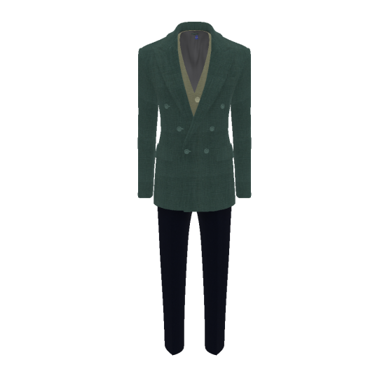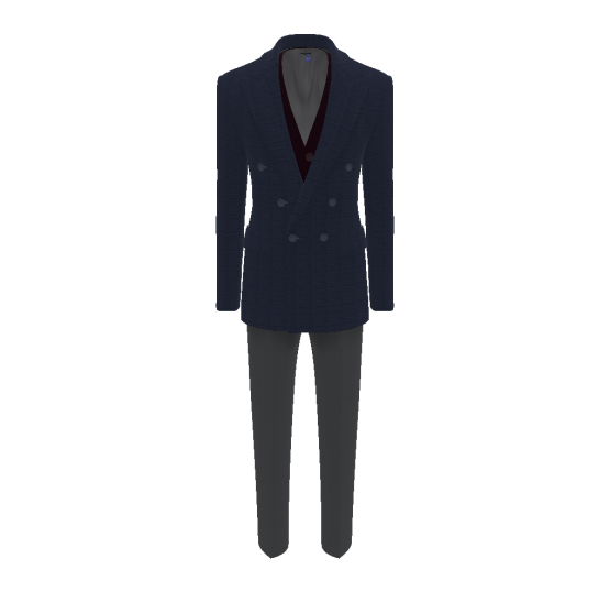 Elevate your presence with a 3-piece ensemble meticulously crafted to your precise specifications, guaranteeing an impeccable fit that radiates refined elegance. This collection masters the "broken suit" aesthetic, pairing a formal 6-button double-breasted jacket in solid black with high-contrast sapphire and slate grey elements.